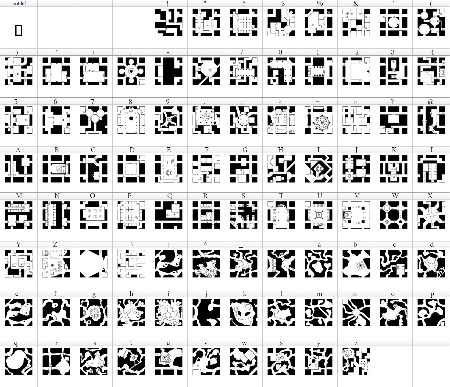 To install them, unzip the file (you'll be sent a link after checkout) and follow the same steps used to install any font on your system. (Right click and click install, or do a web search for installing fonts on your computer type.) Thereafter, you should be able to select the font in your word processor and just type out a dungeon! (You may need to re-open your word processor for it to see a newly installed font.)