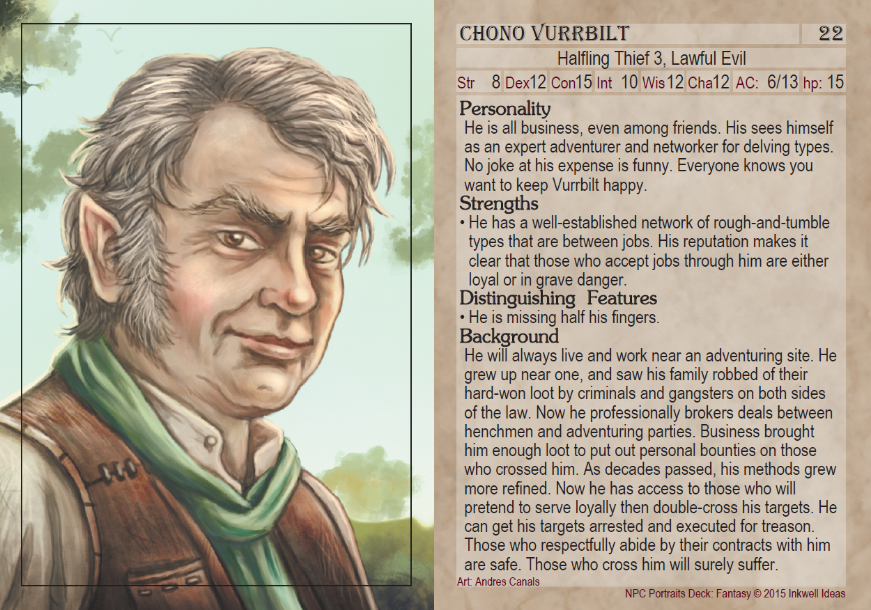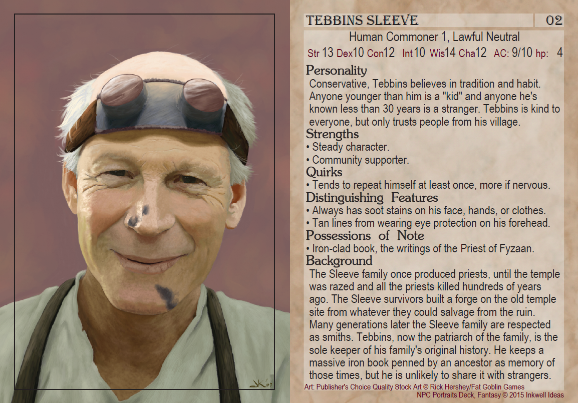 - Portrait of an NPC on one side, generic D&D stats on the other side.