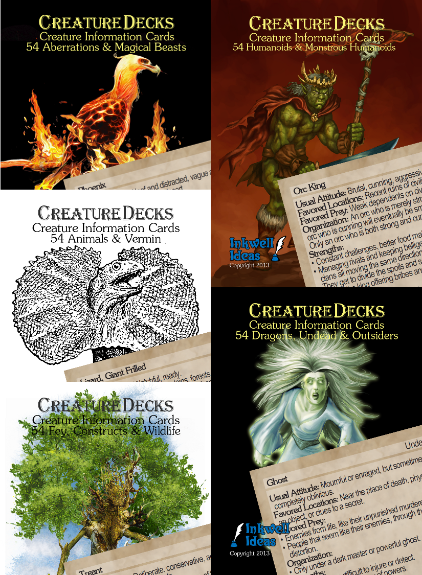 The bundle includes our Aberrations & Magical Beasts Deck; Dragons, Undead & Outsiders Deck; Fey, Constructs & Wildlife Deck; Humanoids & Monstrous Humanoids Deck; and Animals & Vermin Deck. The Animals & Vermin Deck uses black & white art, but the other four decks have full color art.