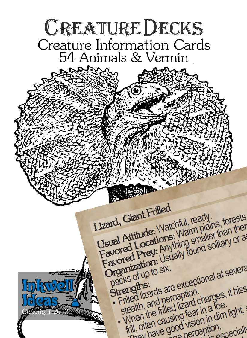 Get a bundle of 5 of our System Neutral/Ecology Information Creature Decks. Each deck has 54 creatures on 54 cards! Plus a cover/checklist card and license info cards. The front of each card has amazing art, while the back has system neutral information about the creature. (Strengths, weaknesses, allies, tactics, etc.)