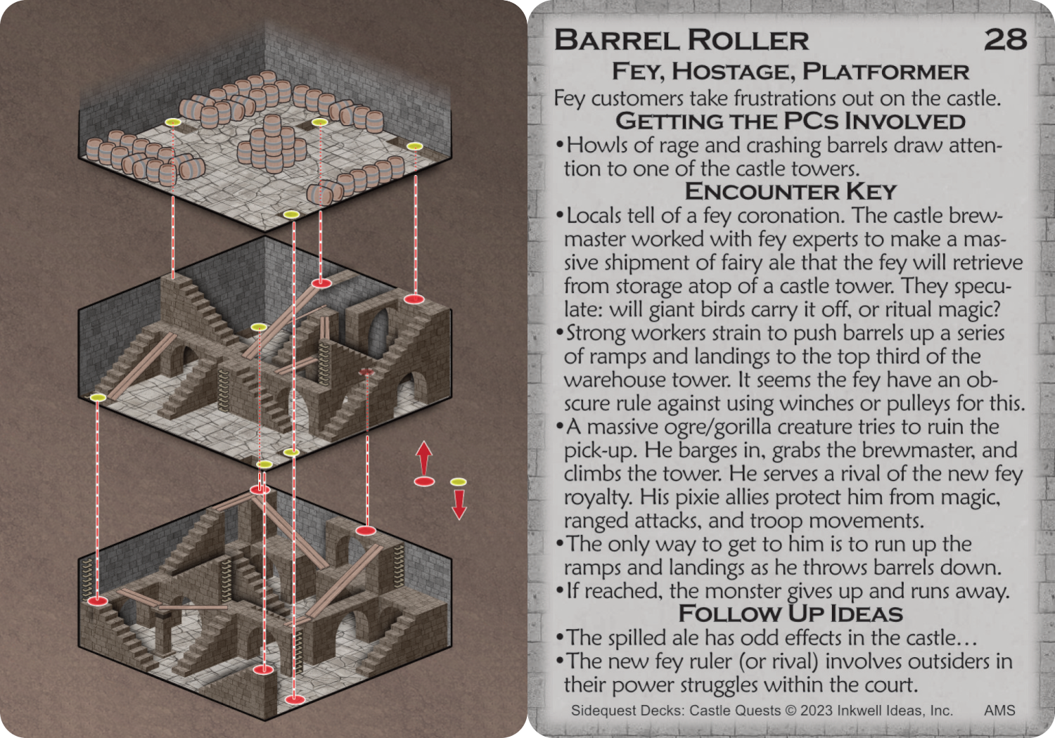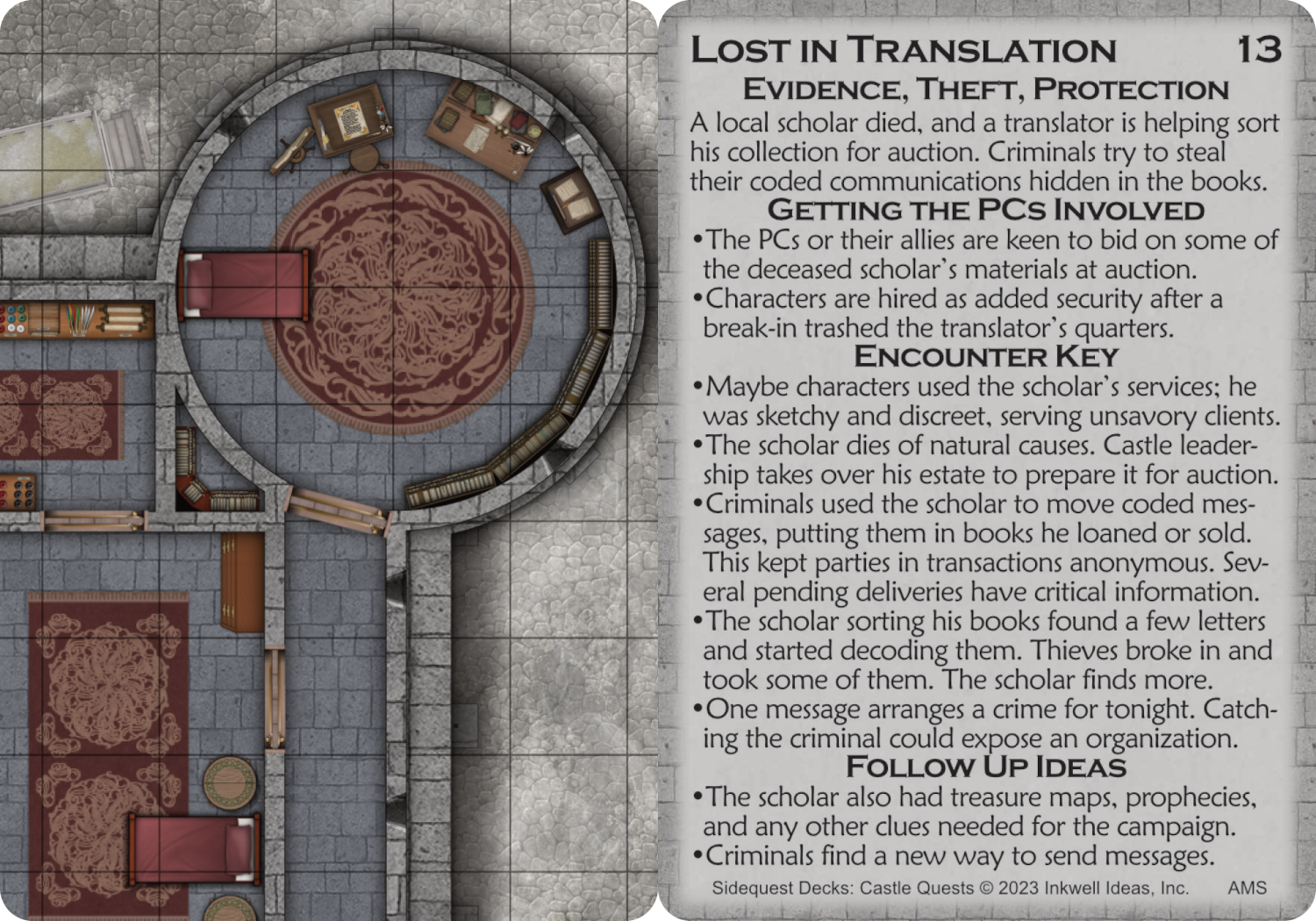 The mini-adventures are short and flexible, so you can adjust them to fit your players, your setting, and your rule set! Three bonus cards provide a castle description generator, special features list, castle name generator, and secrets generator.