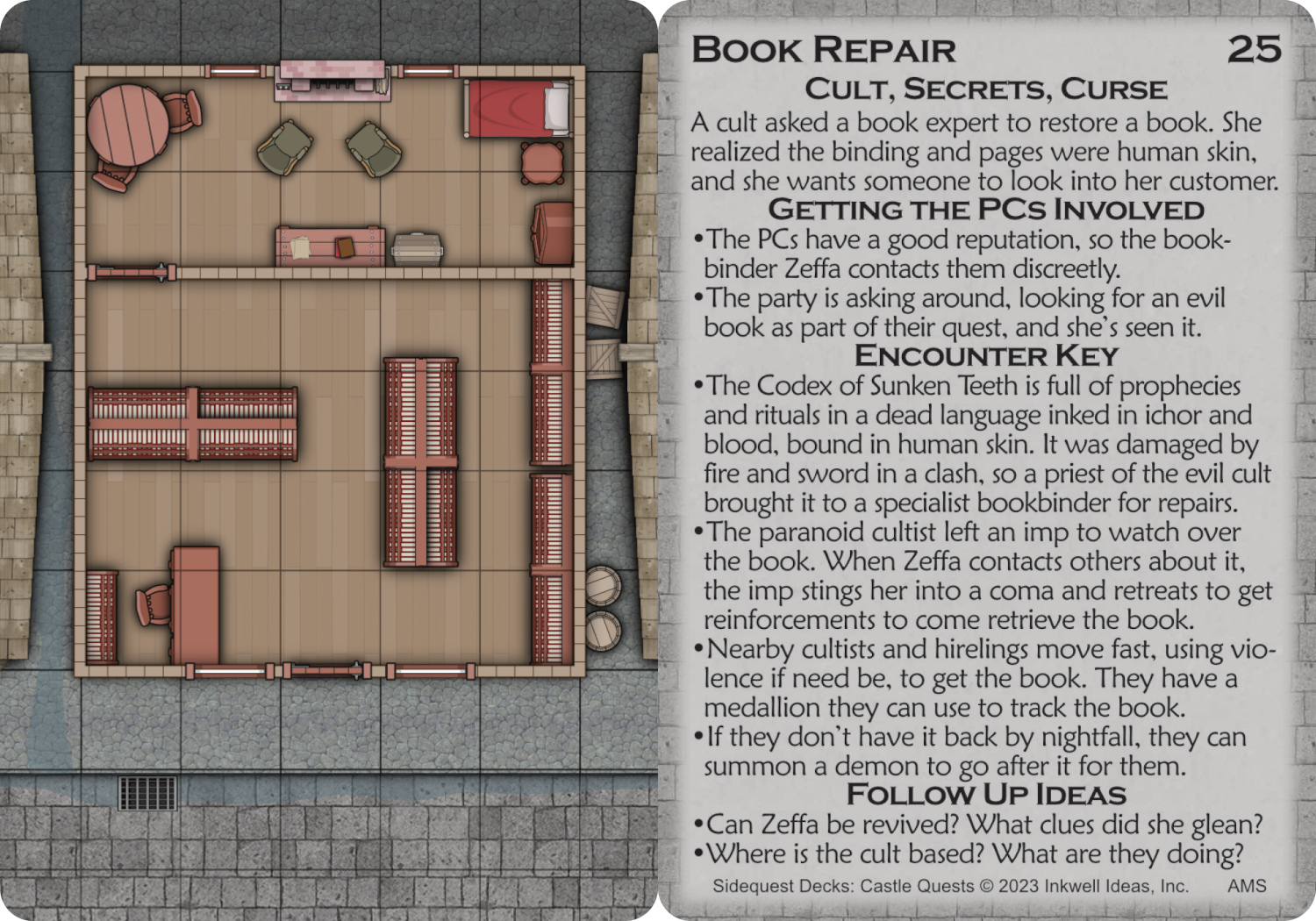 Each card is a mini-quest. One side has the main map area, while the other side is an adventure outline with: GM background info, story hooks, several encounter ideas, and a couple of ways to continue the adventure.