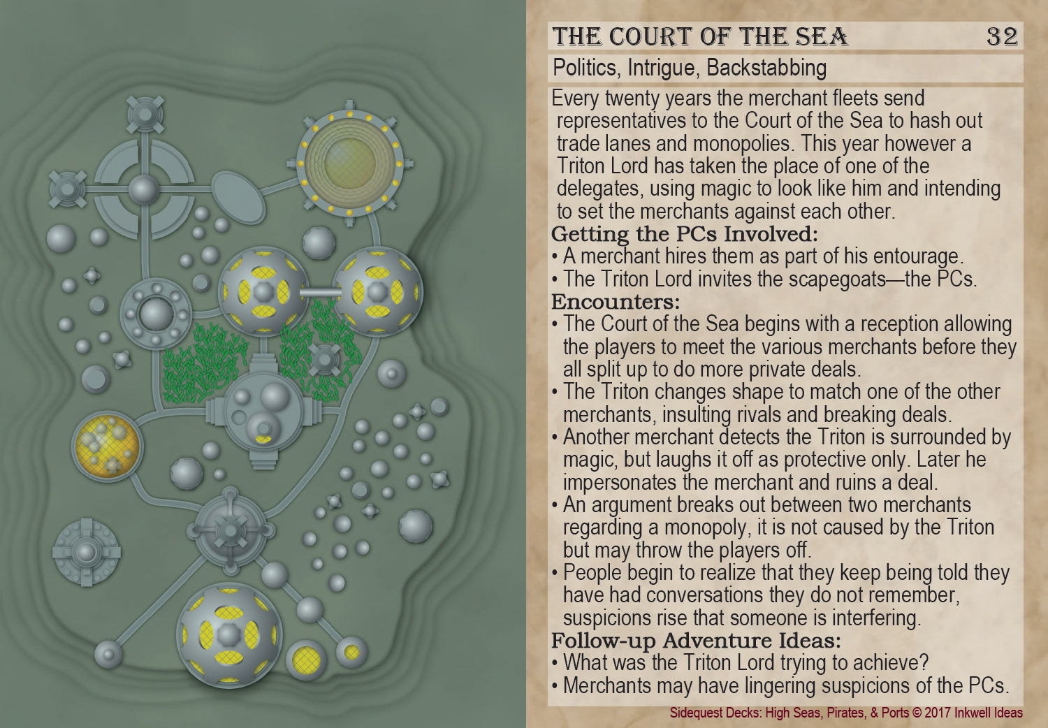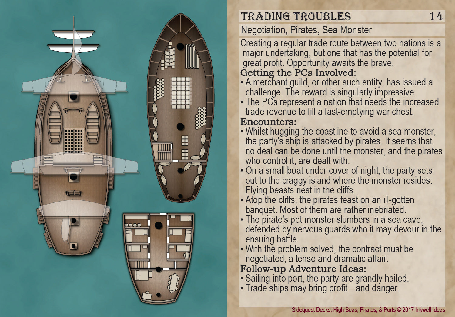 Need sea-faring, pirate, or port adventure ideas for a one-shot or to build a campaign? Use our Sidequest Decks: High Seas, Pirates, & Ports. Each card is a dynamic adventure!